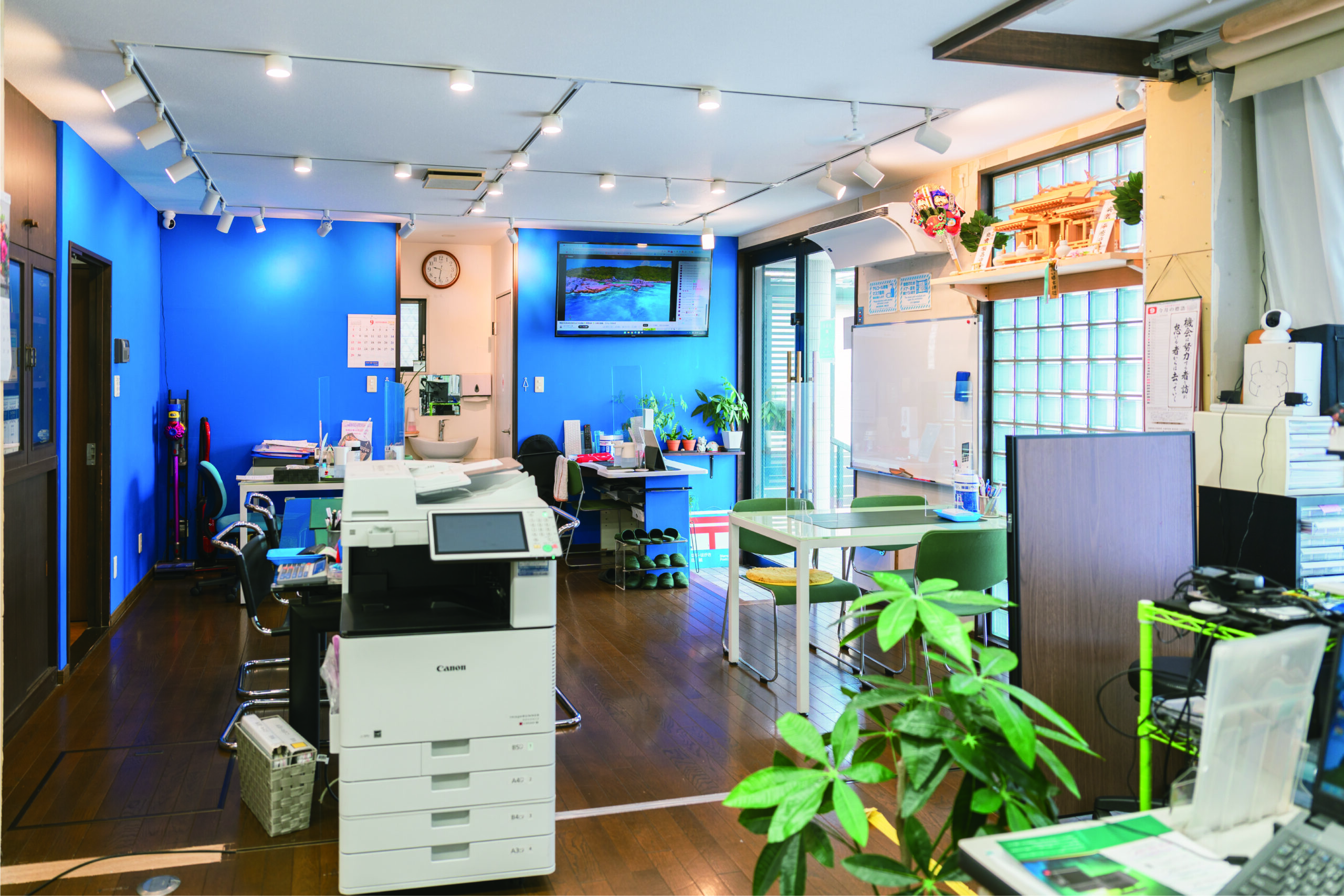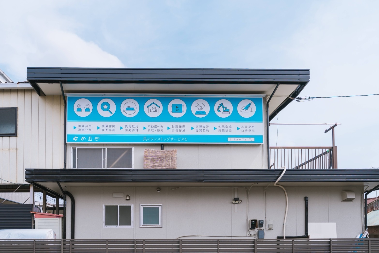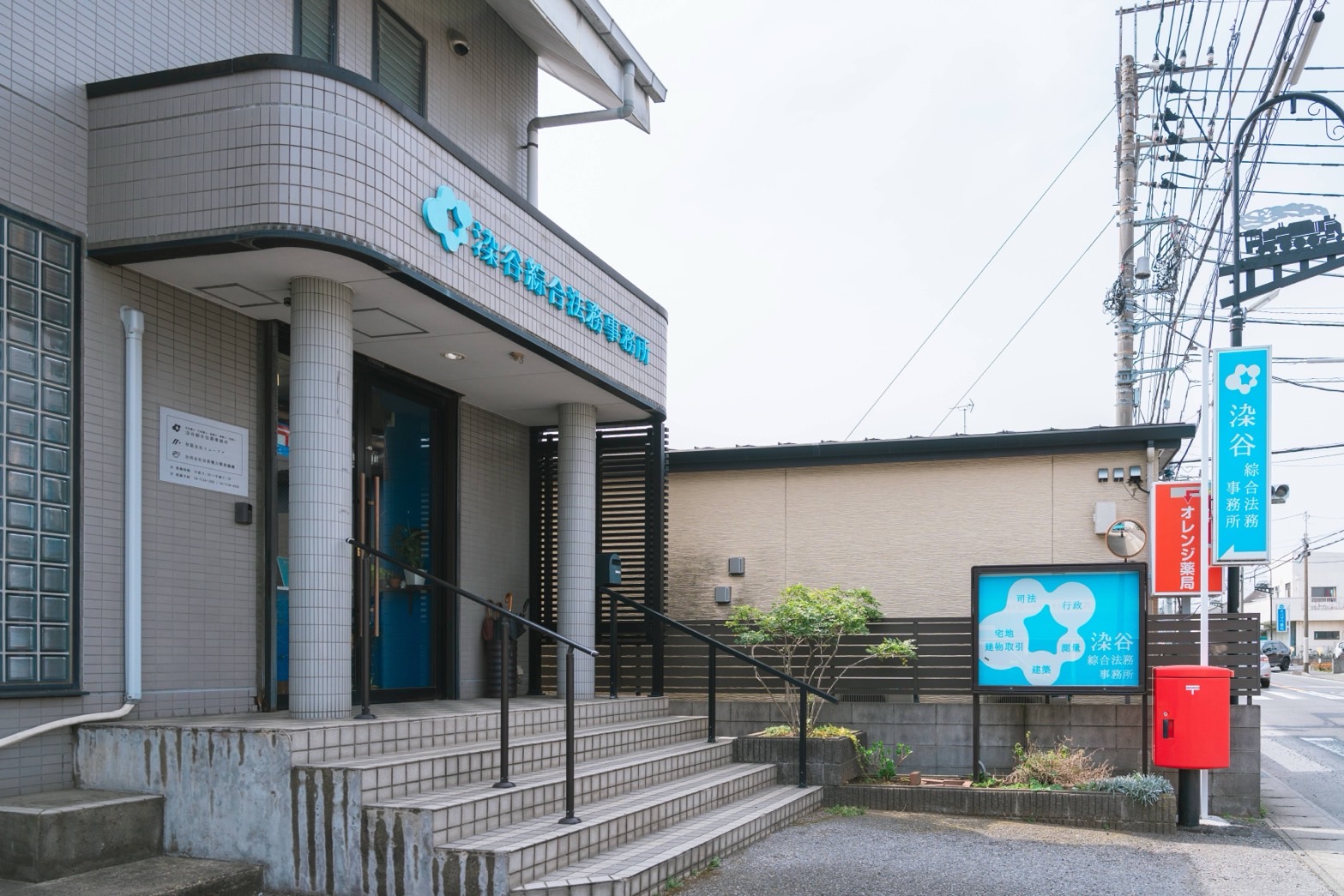 その交差点の左手に事務所がございます。水色の看板と赤い郵便ポストが目印です。